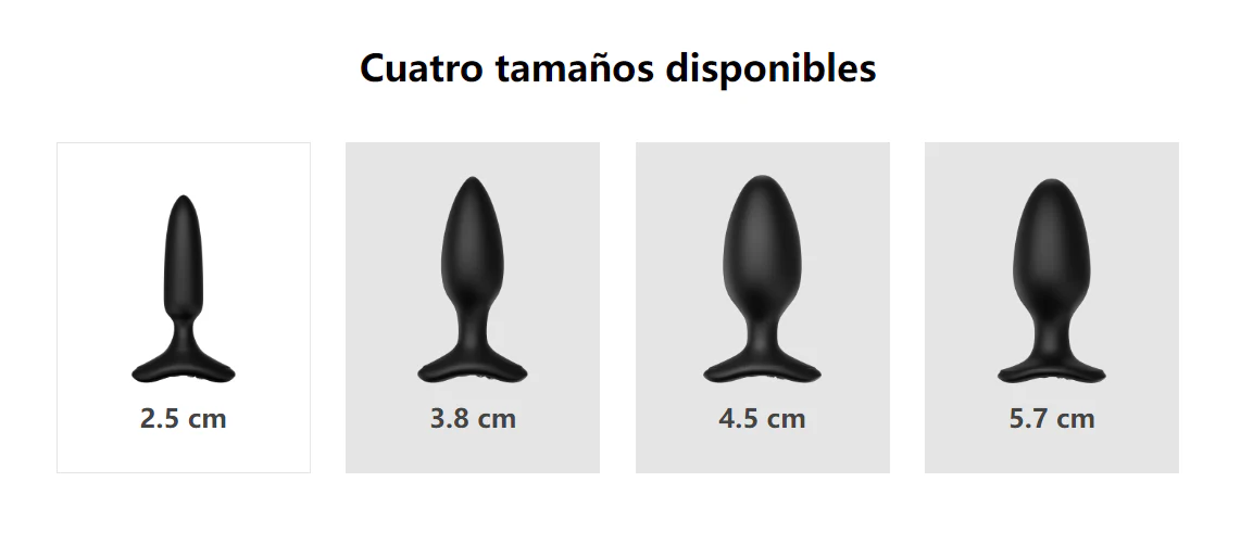 Tamaño XS • Tiempo de uso continuo: Hasta 2 horas • Tiempo de carga: 40 minutos • Diámetro en su punto más ancho: 2.5 cm • Diámetro en su punto más angosto: 1.2 cm • Longitud total: 12 cm • Longitud insertable: 9.8 cm • Diámetro base de extracción: 67 cm Tamaño S • Tiempo de uso continuo: Hasta 4 horas • Tiempo de carga: 60 minutos • Diámetro en su punto más ancho: 3.8 cm • Diámetro en su punto más angosto: 1.7 cm • Longitud total: 121 cm • Longitud insertable: 10 cm • Diámetro base de extracción: 67 cm Tamaño M • Tiempo de uso continuo: Hasta 8 horas • Tiempo de carga: 90 minutos • Diámetro en su punto más ancho: 4.5 cm • Diámetro en su punto más angosto: 1.7 cm • Longitud total: 135 cm • Longitud insertable: 113 cm • Diámetro base de extracción: 67 cm Tamaño L • Tiempo de uso continuo: Hasta 11 horas • Tiempo de carga: 155 minutos • Diámetro en su punto más ancho: 5.7 cm • Diámetro en su punto más angosto: 2.5 cm • Longitud total: 15 cm • Longitud insertable: 131 cm • Diámetro base de extracción: 81 cm
